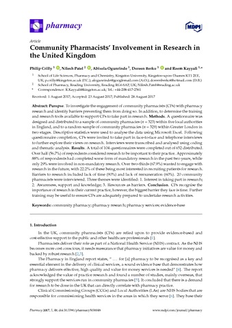 Crilly, P., Patel, N. orcid id iconORCID: https://orcid.org/0000-0002-8600-0663, Ogunrinde, A., Berko, D. and Kayyali, R. (2017) Community pharmacists’ involvement in research in the United Kingdom. Pharmacy, 5 (3). 48. ISSN 2226-4787 doi: 10.3390/pharmacy5030048