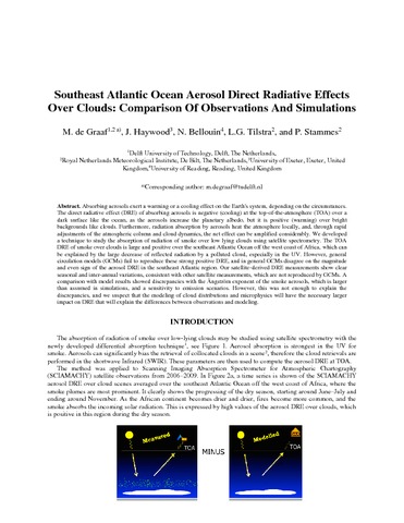 de Graaf, M., Haywood, J., Bellouin, N. orcid id iconORCID: https://orcid.org/0000-0003-2109-9559, Tilstra, L. G. and Stammes, P. (2017) Southeast Atlantic Ocean aerosol direct radiative effects over clouds: comparison of observations and simulations. AIP conference proceedings, 1810 (1). 090002. ISSN 0094-243X doi: 10.1063/1.4975542