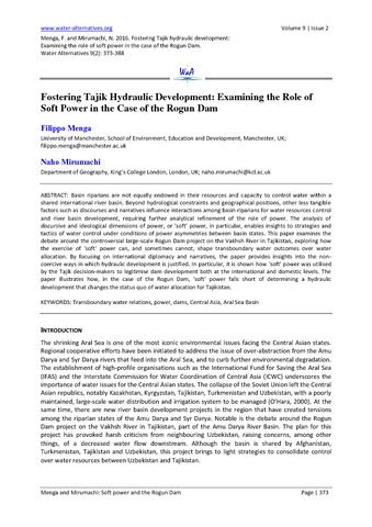 Basin riparians are not equally endowed in their resources and capacity to control water within a shared international river basin. Beyond hydrological constraints and geographical positions, other less tangible factors such as discourses and narratives influence interactions among basin riparians for water resources control and river basin development, requiring further analytical refinement of the role of power. The analysis of discursive and ideological dimensions of power, or 'soft' power, in particular, enables insights to strategies and tactics of water control under conditions of power asymmetries between basin states. This paper examines the debate around the controversial large-scale Rogun Dam project on the Vakhsh River in Tajikistan, exploring how the exercise of 'soft' power can, and sometimes cannot, shape transboundary water outcomes over water allocation. By focusing on international diplomacy and narratives, the paper provides insights into the noncoercive ways in which hydraulic development is justified. In particular, it is shown how 'soft' power was utilised by the Tajik decision-makers to legitimise dam development both at the international and domestic levels. The paper illustrates how, in the case of the Rogun Dam, 'soft' power falls short of determining a hydraulic development that changes the status quo of water allocation for Tajikistan.