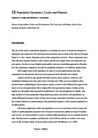 Leigh, S. and Van Emden, H. F. (2017) Population dynamics: cycles and patterns. In: Van Emden, H. F. and Harrington, R. (eds.) Aphids as Crop Pests, 2nd edition. CABI, Wallingford, pp. 262-279. ISBN 9781780647098