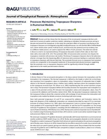 Saffin, L., Gray, S. L. orcid id iconORCID: https://orcid.org/0000-0001-8658-362X, Methven, J. orcid id iconORCID: https://orcid.org/0000-0002-7636-6872 and Williams, K. D. (2017) Processes maintaining tropopause sharpness in numerical models. Journal of Geophysical Research: Atmospheres, 122 (18). pp. 9611-9627. ISSN 2169-8996 doi: 10.1002/2017JD026879