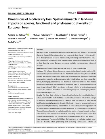 Dimensions of biodiversity loss: spatial mismatch in land-use impacts on species, functional and phylogenetic diversity of European bees.