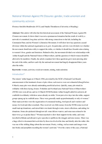 Thomlinson, N. and Sutcliffe-Braithwaite, F. (2018) National Women Against Pit Closures: gender, trade unionism, and community activism. Contemporary British History, 32 (1). pp. 78-100. ISSN 1743-7997 doi: 10.1080/13619462.2017.1408540