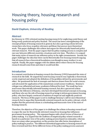 Clapham, D. (2018) Housing theory, housing research and housing policy. Housing, Theory and Society, 35 (2). pp. 163-177. ISSN 1403-6096 doi: 10.1080/14036096.2017.1366937