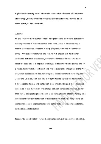 In 1711, an anonymous author added a new preface and a new final part to two existing volumes of Histoire secrette de La reine Zarah, et des Zaraziens, a French translation of The Secret History of Queen Zarah and the Zarazians (1705). Previous scholarship on this well-known English text has neither addressed its French translations, nor analysed these additions. This essay reads the additions as a response to changes in British domestic politics and to political relations between Britain and France during the final phase of the War of Spanish Succession. It also, however, uses the relationship between Queen Zarah and La reine Zarah as a lens through which to explore the relationship between secret history and translation more broadly. It argues that translation conceived of as a movement or exchange between conditions or states, rather than just as a linguistic phenomenon, is a defining feature of secret history. The connections between translation and secret history offer new perspectives on eighteenth-century approaches towards genre, national and partisan identity, authorship and attribution.