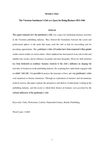Members only: the Victorian gentlemen's club as a space for doing business 1843-1900.