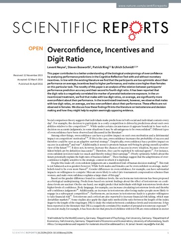 This paper contributes to a better understanding of the biological underpinnings of overconfidence by analyzing performance predictions in the Cognitive Reflection Test with and without monetary incentives. In line with the existing literature we find that the participants are too optimistic about their performance on average; incentives lead to higher performance; and males score higher than females on this particular task. The novelty of this paper is an analysis of the relation between participants’ performance prediction accuracy and their second to fourth digit ratio. It has been reported that the digit ratio is a negatively correlated bio-marker of prenatal testosterone exposure. In the un-incentivized treatment, we find that males with low digit ratios, on average, are significantly more overconfident about their performance. In the incentivized treatment, however, we observe that males with low digit ratios, on average, are less overconfident about their performance. These effects are not observed in females. We discuss how these findings fit into the literature on testosterone and decision making and how they might help to explain seemingly opposing evidence.