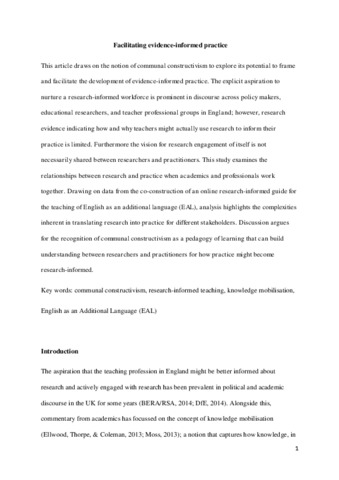 This article draws on the notion of communal constructivism to explore its potential to frame and facilitate the development of evidence-informed practice. The explicit aspiration to nurture a research-informed workforce is prominent in discourse across policy makers, educational researchers, and teacher professional groups in England; however, research evidence indicating how and why teachers might actually use research to inform their practice is limited. Furthermore the vision for research engagement of itself is not necessarily shared between researchers and practitioners. This study examines the relationships between research and practice when academics and professionals work together. Drawing on data from the co-construction of an online research-informed guide for the teaching of English as an additional language (EAL), analysis highlights the complexities inherent in translating research into practice for different stakeholders. Discussion argues for the recognition of communal constructivism as a pedagogy of learning that can build understanding between researchers and practitioners for how practice might become research-informed.