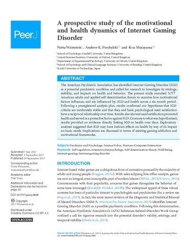Weinstein, N., Przybylski, A. K. and Murayama, K. (2017) A prospective study of the motivational and health dynamics of Internet Gaming Disorder. PeerJ, 5. e3838. ISSN 2167-8359 doi: 10.7717/peerj.3838