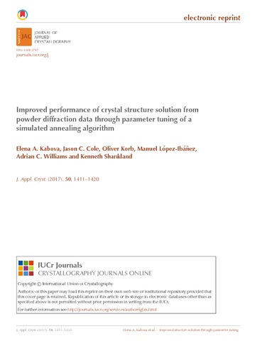 Kabova, E. A., Cole, J. C., Korb, O., López-Ibáñez, M., Williams, A. orcid id iconORCID: https://orcid.org/0000-0003-3654-7916 and Shankland, K. orcid id iconORCID: https://orcid.org/0000-0001-6566-0155 (2017) Improved performance of crystal structure solution from powder diffraction data through parameter tuning of a simulated annealing algorithm. Journal of Applied Crystallography, 50. pp. 1411-1420. ISSN 0021-8898 doi: 10.1107/S1600576717012602