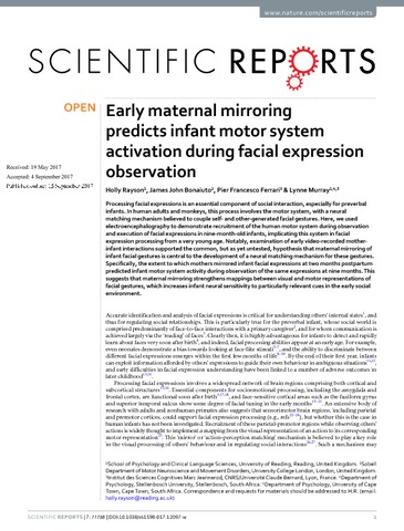 Rayson, H., Bonaiuto, J. J., Ferrari, P. F. and Murray, L. (2017) Early maternal mirroring predicts infant motor system activation during facial expression observation. Scientific Reports, 7 (1). 11738. ISSN 2045-2322 doi: 10.1038/s41598-017-12097-w