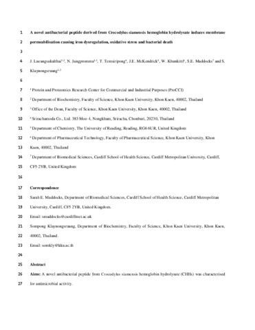 Lueangsakulthai, J., Jangpromma, N., Temsiripong, T., McKendrick, J. E. orcid id iconORCID: https://orcid.org/0000-0003-2275-0569, Khunkitti, W., Maddocks, S.E. and Klaynongsruang, S. (2017) A novel antibacterial peptide derived from Crocodylus siamensis haemoglobin hydrolysate induces membrane permeabilization causing iron dysregulation, oxidative stress and bacterial death. Journal of Applied Microbiology, 123 (4). pp. 819-831. ISSN 1364-5072 doi: 10.1111/jam.13539