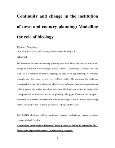 Shepherd, E. (2018) Continuity and change in the institution of town and country planning: modelling the role of ideology. Planning Theory, 17 (4). pp. 494-513. ISSN 1741-3052 doi: 10.1177/1473095217737587