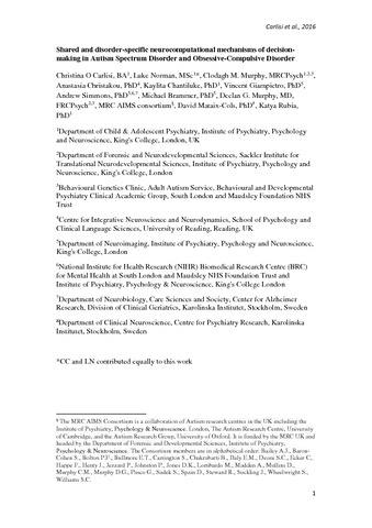 Carlisi, C. O., Norman, L. J., Murphy, C. M., Christakou, A. orcid id iconORCID: https://orcid.org/0000-0002-4267-3436, Chantiluke, K., Giampietro, V., Simmons, A., Brammer, M., Murphy, D. M., Mataix-Cols, D., Rubia, K. and MRC AIMS consortium (2017) Shared and disorder-specific neurocomputational mechanisms of decision-making in Autism Spectrum Disorder and Obsessive-Compulsive Disorder. Cerebral Cortex, 27 (12). pp. 5804-5816. ISSN 1460-2199 doi: 10.1093/cercor/bhx265