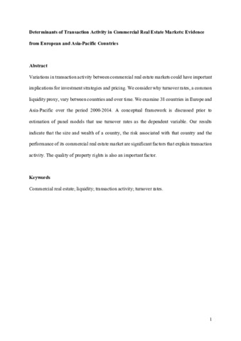 Variations in transaction activity between commercial real estate markets could have important implications for investment strategies and pricing. We consider why turnover rates, a com m on liquidity proxy, vary between countries and over time. We examine 38 countries in Europe and Asia-Pacific over the period 2000–2014. A conceptual framework is discussed prior to estimation of panel models that use turnover rates as the dependent variable. Our results indicate that the size and wealth of a country, the risk associated with that country and the performance of its commercial real estate market are significant factors that explain transaction activity. The quality of property rights is also an important factor.