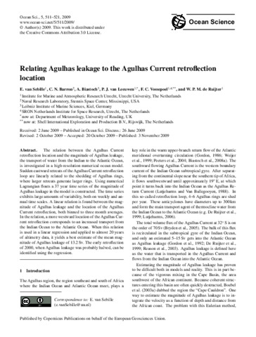 Van Sebille, E., Barron, C.N., biastoch, A., Van Leeuwen, P. J., Vossepoel, F.C. and De Ruijter, W.P.M. (2009) Relating Agulhas leakage to the Agulhas Current retroflection location. Ocean Science, 5 (4). pp. 511-521. ISSN 1812-0784 doi: 10.5194/os-5-511-2009