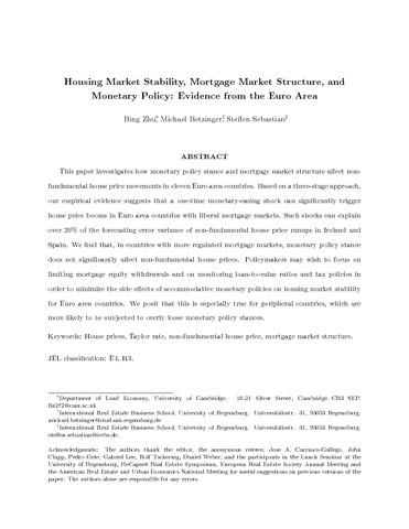 Zhu, B., Betzinger, M. and Steffen, S. (2017) Housing market stability, mortgage market structure, and monetary policy: evidence from the euro area. Journal of Housing Economics, 37. pp. 1-21. ISSN 1051-1377 doi: 10.1016/j.jhe.2017.04.001