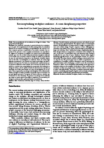 Rook, C. orcid id iconORCID: https://orcid.org/0000-0002-1646-1245, Smith, L., Johnstone, J., Rossato, C., Guillermo Felipe, L. S., Arturo, D. S. and Roberts, J. (2018) Reconceptualising workplace resilience - a cross-disciplinary perspective. Annals of Psychology, 34 (2). pp. 332-339. ISSN 1695-2294 doi: 10.6018/analesps.34.2.299371
