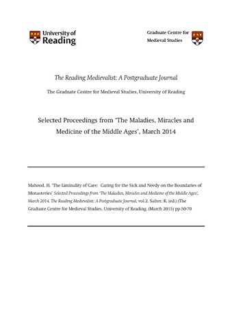 Mahood, H. (2015) The liminality of care: caring for the sick and needy on the boundaries of monasteries. The Reading Medievalist, 2. pp. 50-70. doi: 10.6084/m9.figshare.c.3709447.v1