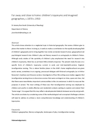 Uncontrolled Keywords | Children's geographies; literary cartography; landscapes of play; transfigurative naming |