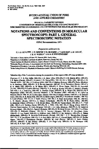 Schutte, C. J. H., Bertie, E., Bunker, P. R., Hougen, T., Mills, I., Watson, J. K. G. and Winnewisser, B. P. (1997) Notations and conventions in molecular spectroscopy: part 1. General spectroscopic notation. Pure and Applied Chemistry, 69 (8). pp. 1633-1639. ISSN 0033-4545