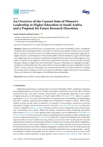 (Abalkhail 2017) Abalkhail, Jouharah M. 2017. Women and leadership: Challenges and opportunities in Saudi higher education. Career Development International 22: 165–83.