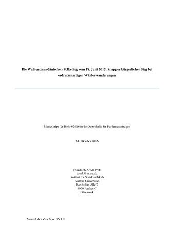 Arndt, C. (2016) Die Wahlen zum dänischen Folketing vom 18. Juni 2015: knapper bürgerlicher Sieg bei erdrutschartigen Wählerwanderungen. Zeitschrift für Parlamentsfragen, 47 (4). pp. 771-782. ISSN 0340-1758 doi: 10.5771/0340-1758-2016-4-771