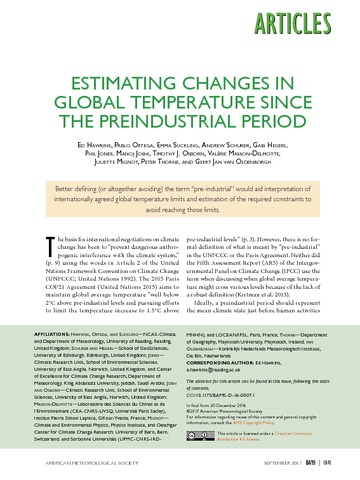 Hawkins, E. orcid id iconORCID: https://orcid.org/0000-0001-9477-3677, Ortega, P., Suckling, E., Schurer, A., Hegerl, G., Jones, P., Joshi, M., Osborn, T. J., Masson-Delmotte, V., Mignot, J., Thorne, P. and van Oldenborgh, G. J. (2017) Estimating changes in global temperature since the preindustrial period. Bulletin of the American Meteorological Society, 98 (9). pp. 1841-1856. ISSN 1520-0477 doi: 10.1175/bams-d-16-0007.1