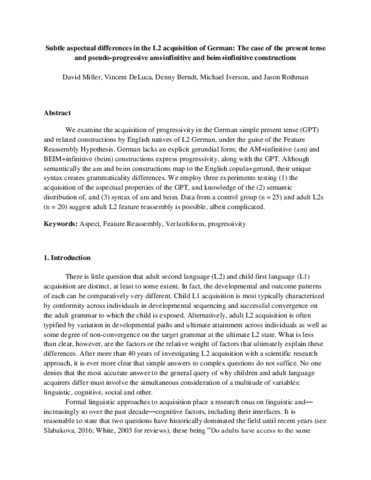 Miller, D., DeLuca, V., Berndt, D., Iverson, M. and Rothman, J. (2017) Subtle aspectual difference in the L2 acquisition of German: the case of pseudo-progressives AM+infinitive versus BEIM+infinitive. In: Blom, E., Cornips, L. and Schaffer, J. (eds.) Cross-linguistic Influence in Bilingualism: in honor of Aafke Hulk. Studies in Bilingualism (52). John Benjamins, pp. 207-230. ISBN 9789027241948 doi: 10.1075/sibil.52.10mil