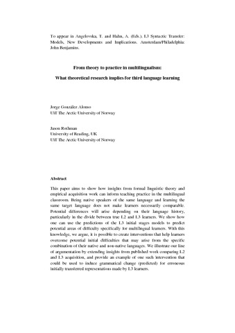 Gonzalez Alonso, J. and Rothman, J. (2017) From theory to practice in multilingualism: what theoretical research implies for third language learning. In: Angelovska, T. and Hahn, A. (eds.) L3 Syntactic Transfer: Models, new developments and implications. John Benjamins Publishing Company, Amsterdam, The Netherlands, pp. 277-298, Chapter 12. ISBN 9789027243768 doi: 10.1075/bpa.5.13gon