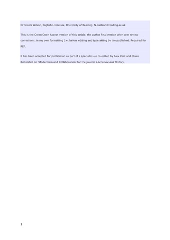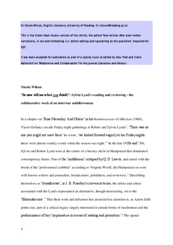 ‘So now tell me what you think!’: Sylvia Lynd's collaborative reading and reviewing - the collaborative work of an interwar middlewoman.