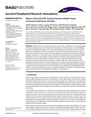 Nakamura, J., Camargo, S. J., Sobel, A. H., Henderson, N., Emanuel, K. A., Kumar, A., LaRow, T. E., Murakami, H., Roberts, M. J., Scoccimarro, E., Vidale, P. L. orcid id iconORCID: https://orcid.org/0000-0002-1800-8460, Wang, H., Wehner, M. F. and Zhao, M. (2017) Western North Pacific tropical cyclone model tracks in present and future climates. Journal of Geophysical Research: Atmospheres, 122 (18). pp. 9721-9744. ISSN 2169-8996 doi: 10.1002/2017jd027007