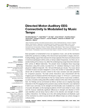 • Daly, I., Hallowell, J., Hwang, F., Kirke, A., Malik, A., Roesch, E., et al. (2014a). "Changes in Music Tempo Entrain Movement Related Brain Activity", in: 36th Annual International Conf. of the IEEE EMBS. (Chicago, IL, USA: IEEE).