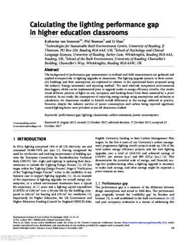van Someren, K., Beaman, P. orcid id iconORCID: https://orcid.org/0000-0001-5124-242X and Shao, L. orcid id iconORCID: https://orcid.org/0000-0002-1544-7548 (2018) Calculating the lighting performance gap in higher education classrooms. International Journal of Low Carbon Technologies, 13 (1). pp. 15-22. ISSN 1748-1325 doi: 10.1093/ijlct/ctx015