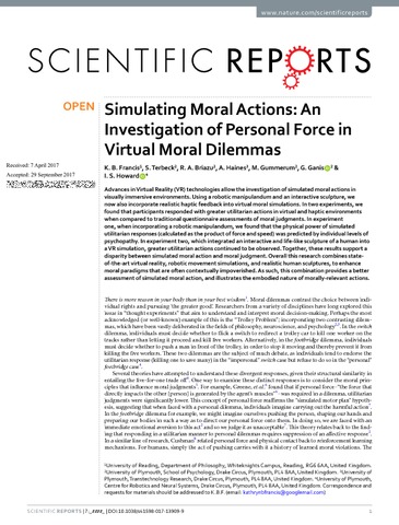 Francis, K. B., Terbeck, S., Briazu, R. A., Haines, A., Gummerum, M., Ganis, G. and Howard, I. S. (2017) Simulating moral actions: an investigation of personal force in virtual moral dilemmas. Scientific Reports, 7. 13954. ISSN 2045-2322 doi: 10.1038/s41598-017-13909-9