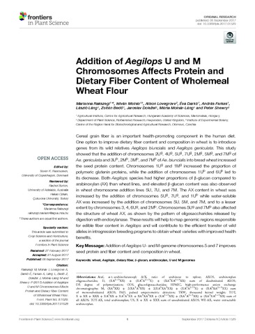 Rakszegi, M., Molnár, I., Lovegrove, A., Darkó, É., Farkas, A., Láng, L., Bedő, Z., Doležel, J., Molnár-Láng, M. and Shewry, P. (2017) Addition of Aegilops U and M chromosomes affects protein and dietary fiber content of wholemeal wheat flour. Frontiers in Plant Science, 8. 1529. ISSN 1664-462X doi: 10.3389/fpls.2017.01529