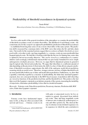 Bódai, T. (2015) Predictability of threshold exceedances in dynamical systems. Physica D: Nonlinear Phenomena, 313. pp. 37-50. ISSN 0167-2789 doi: 10.1016/j.physd.2015.08.007