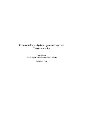 Bodai, T. (2017) Extreme Value Analysis in dynamical systems: two case studies. In: Franzke, C. L. E. and OKane, T. J. (eds.) Nonlinear and Stochastic Climate Dynamics. Cambridge University Press, pp. 392-429. ISBN 9781316339251 doi: 10.1017/9781316339251.015