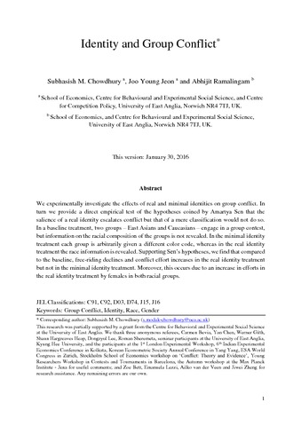 We experimentally investigate the effects of real and minimal identities on group conflict. In turn we provide a direct empirical test of the hypotheses coined by Amartya Sen that the salience of a real identity escalates conflict but that of a mere classification would not do so. In a baseline treatment, two groups – East Asians and Caucasians – engage in a group contest, but information on the racial composition of the groups is not revealed. In the minimal identity treatment each group is arbitrarily given a different color code, whereas in the real identity treatment the race information is revealed. Supporting Sen’s hypotheses, we find that compared to the baseline, free-riding declines and conflict effort increases in the real identity treatment but not in the minimal identity treatment. Moreover, this occurs due to an increase in efforts in the real identity treatment by females in both racial groups.