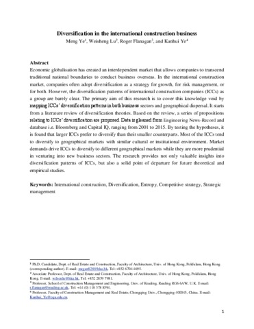 Ye, M., Lu, W., Flanagan, R. and Ye, K. (2018) Diversification in the international construction business. Construction Management and Economics, 36 (6). pp. 348-361. ISSN 1466-433X doi: 10.1080/01446193.2017.1388530