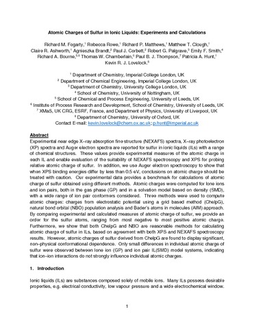 Experimental near edge X-ray absorption fine structure (NEXAFS) spectra, X-ray photoelectron (XP) spectra and Auger electron spectra are reported for sulfur in ionic liquids (ILs) with a range of chemical structures. These values provide experimental measures of the atomic charge in each IL and enable the evaluation of the suitability of NEXAFS spectroscopy and XPS for probing the relative atomic charge of sulfur. In addition, we use Auger electron spectroscopy to show that when XPS binding energies differ by less than 0.5 eV, conclusions on atomic charge should be treated with caution. Our experimental data provides a benchmark for calculations of the atomic charge of sulfur obtained using different methods. Atomic charges were computed for lone ions and ion pairs, both in the gas phase (GP) and in a solvation model (SMD), with a wide range of ion pair conformers considered. Three methods were used to compute the atomic charges: charges from the electrostatic potential using a grid based method (ChelpG), natural bond orbital (NBO) population analysis and Bader’s atoms in molecules (AIM) approach. By comparing the experimental and calculated measures of the atomic charge of sulfur, we provide an order for the sulfur atoms, ranging from the most negative to the most positive atomic charge. Furthermore, we show that both ChelpG and NBO are reasonable methods for calculating the atomic charge of sulfur in ILs, based on the agreement with both the XPS and NEXAFS spectroscopy results. However, the atomic charges of sulfur derived from ChelpG are found to display significant, non-physical conformational dependence. Only small differences in individual atomic charge of sulfur were observed between lone ion (GP) and ion pair IL(SMD) model systems, indicating that ion–ion interactions do not strongly influence individual atomic charges.