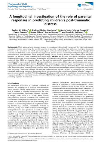 Hiller, R. M., Meiser-Stedman, R., Lobo, S., Creswell, C., Fearon, P., Ehlers, A., Murray, L. and Halligan, S. (2018) A longitudinal investigation of the role of parental responses in predicting children’s post-traumatic distress. Journal of Child Psychology and Psychiatry, 59 (7). pp. 781-789. ISSN 0021-9630 doi: 10.1111/jcpp.12846