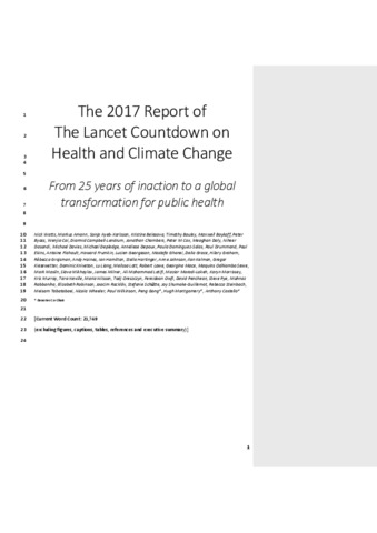 Watts, N., Amann, M., Ayeb-Karlsson, S., Belesova, K., Bouley, T., Boykoff, M., Byass, P., Cai, W., Campbell-Lendrum, D., Chambers, J., Cox, P. M., Daly, M., Dasandi, N., Davies, M., Depledge, M., Depoux, A., Dominguez-Salas, P., Drummond, P., Ekins, P., Flahault, A., Frumkin, H., Georgeson, L., Ghanei, M., Grace, D., Graham, H., Grojsman, R., Haines, A., Hamilton, I., Hartinger, S., Johnson, A., Kelman, I., Kiesewetter, G., Kniveton, D., Liang, L., Lott, M., Lowe, R., Mace, G., Odhiambo Sewe, M., Maslin, M., Mikhaylov, S., Milner, J., Latifi, A. M., Moradi-Lakeh, M., Morrissey, K., Murray, K., Neville, T., Nilsson, M., Oreszczyn, T., Owfi, F., Pencheon, D., Pye, S., Rabbaniha, M., Robinson, E. ORCID: https://orcid.org/0000-0002-4950-0183, Rocklöv, J., Schütte, S., Shumake-Guillemot, J., Steinbach, R., Tabatabaei, M., Wheeler, N., Wilkinson, P., Gong, P., Montgomery, H. and Costello, A.