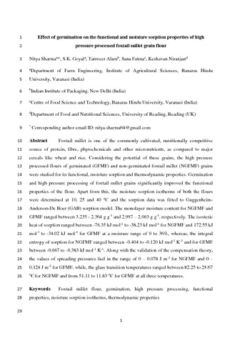 Effect of germination on the functional and moisture sorption properties of high pressure processed foxtail millet grain flour