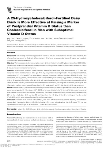 Background: One strategy for improving population vitamin D status is consumption of fortified foods. However, the effects of dairy products fortified with different vitamin D isoforms on postprandial vitamin D status and metabolic outcomes have not been addressed. Objective: We investigated whether consumption of dairy drinks fortified with either 25-hydroxycholecalciferol [25(OH)D3] or cholecalciferol (vitamin D3) had differential effects on 24-h circulating plasma 25(OH)D3 concentration (a marker of vitamin D status) and cardiometabolic risk markers. Methods: A randomized, controlled, 3-way crossover, double-blind, postprandial study was conducted in 17 men with suboptimal vitamin D status [mean 6 SEM age: 49 6 3 y; body mass index (in kg/m2): 26.4 6 0.6; and plasma 25(OH)D3 concentration: 31.7 6 3.4 nmol/L]. They were randomly assigned to consume 3 different test meals (4.54 MJ, 51 g fat, 125 g carbohydrate, and 23 g protein),which contained either a nonfortified dairy drink (control), 20 mg 25(OH)D3-fortified (+HyD3) dairy drink, or 20 mg vitamin D3–fortified (+D3) dairy drink with toasted bread and jam on different occasions, separated by a 2-wk washout. Plasma 25(OH)D3 concentrations and cardiometabolic risk markers, including vascular stiffness, serum lipids, and inflammatory markers, were measured frequently within 8 h postprandially and 24 h after the dairy drink was consumed. Results: Plasma 25(OH)D3 concentrations (the primary outcome) were significantly higher after the +HyD3 dairy drink was consumed compared with +D3 and control (P = 0.019), which was reflected in the 1.5-fold and 1.8-fold greater incremental area under the curve for the 0–8 h response, respectively. The change in plasma 25(OH)D3 concentrations from baseline to 24 h for the +HyD3 dairy drink was also 0.9-fold higher than the +D3 dairy drink and 4.4-fold higher than the control (P < 0.0001), which were not significantly different from each other. Conclusion: The dairy drink fortified with 25(OH)D3 was more effective at raising plasma 25(OH)D3 concentrations postprandially than was the dairy drink fortified with vitamin D3 in men with suboptimal vitamin D status.