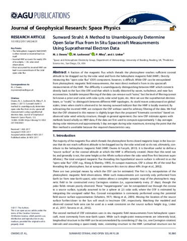 Owens, M. J. orcid id iconORCID: https://orcid.org/0000-0003-2061-2453, Lockwood, M. orcid id iconORCID: https://orcid.org/0000-0002-7397-2172, Riley, P. and Linker, J. (2017) Sunward strahl: a method to unambiguously determine open solar flux from in situ spacecraft measurements using suprathermal electron data. Journal of Geophysical Research: Space Physics, 122 (11). pp. 10980-10989. ISSN 2169-9402 doi: 10.1002/2017JA024631