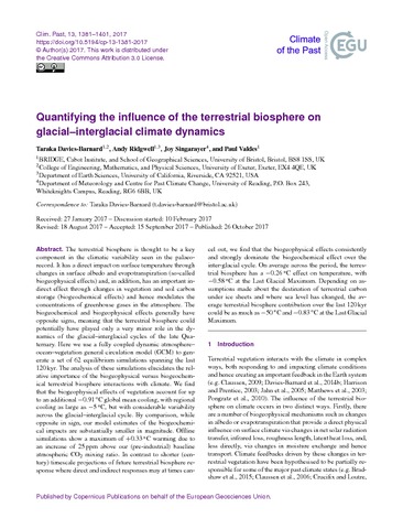 Davies-Barnard, T., Ridgwell, A., Singarayer, J. and Valdes, P. (2017) Quantifying the influence of the terrestrial biosphere on glacial–interglacial climate dynamics. Climate of the Past, 13 (10). pp. 1381-1401. ISSN 1814-9332 doi: 10.5194/cp-13-1381-2017