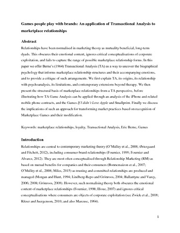 Relationships have been normalised in marketing theory as mutuality beneficial, long-term dyads. This obscures their emotional content, ignores critical conceptualisations of corporate exploitation, and fails to capture the range of possible marketplace relationship forms. In this paper we offer Berne’s (1964) Transactional Analysis (TA) as a way to uncover the biographical psychology that informs marketplace relationship structures and their accompanying emotions, and to provide a critique of such arrangements. We first explain TA, its origins, its relationship with psychoanalysis, its limitations, and contemporary extensions beyond therapy. We then present the structural basis of marketplace relationships from a TA perspective, before illustrating how TA Game Analysis can be applied through an analysis of the iPhone and related mobile phone contracts, and the Games If I didn’t Love Apple and Smallprint. Finally we discuss the implications of such an approach for transforming market practices based on recognition of Marketplace Games and their modification.