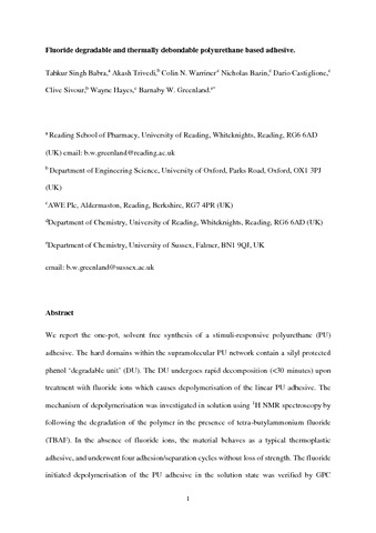 We report the one-pot, solvent free synthesis of a stimuli-responsive polyurethane (PU) adhesive. The hard domains within the supramolecular PU network contain a silyl protected phenol ‘degradable unit’ (DU). The DU undergoes rapid decomposition (<30 minutes) upon treatment with fluoride ions which causes depolymerisation of the linear PU adhesive. The mechanism of depolymerisation was investigated in solution using 1H NMR spectroscopy by following the degradation of the polymer in the presence of tetra-butylammonium fluoride (TBAF). In the absence of fluoride ions, the material behaves as a typical thermoplastic adhesive, and underwent four adhesion/separation cycles without loss of strength. The fluoride initiated depolymerisation of the PU adhesive in the solution state was verified by GPC analysis, showing reduction in Mn from 26.1 kgmol-1 for the pristine PU to 6.2 kgmol-1 for the degraded material. Degradation studies on solid samples of the PU which had been immersed in acetone/TBAF solution for 30 minutes exhibited a 91 % reduction in their modulus of toughness (from 27 to 2 MJ m-3). Lap shear adhesion studies showed the fluoride responsive PU was an excellent material to join metallic, plastic, glass and wood surfaces. Pull adhesion tests confirmed that immersing the adhesive in TBAF/Acetone solution resulted in a reduction in strength of up to 40% (from 160 N to 95 N at break) after drying.