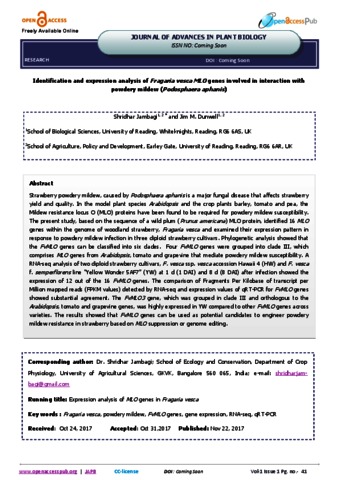 Jambagi, S. and Dunwell, J. M. orcid id iconORCID: https://orcid.org/0000-0003-2147-665X (2017) Identification and expression analysis of Fragaria vesca MLO genes involved in interaction with powdery mildew (Podosphaera aphanis). Journal of Advances in Plant Biology, 1 (1). pp. 40-54. ISSN 2638-4469